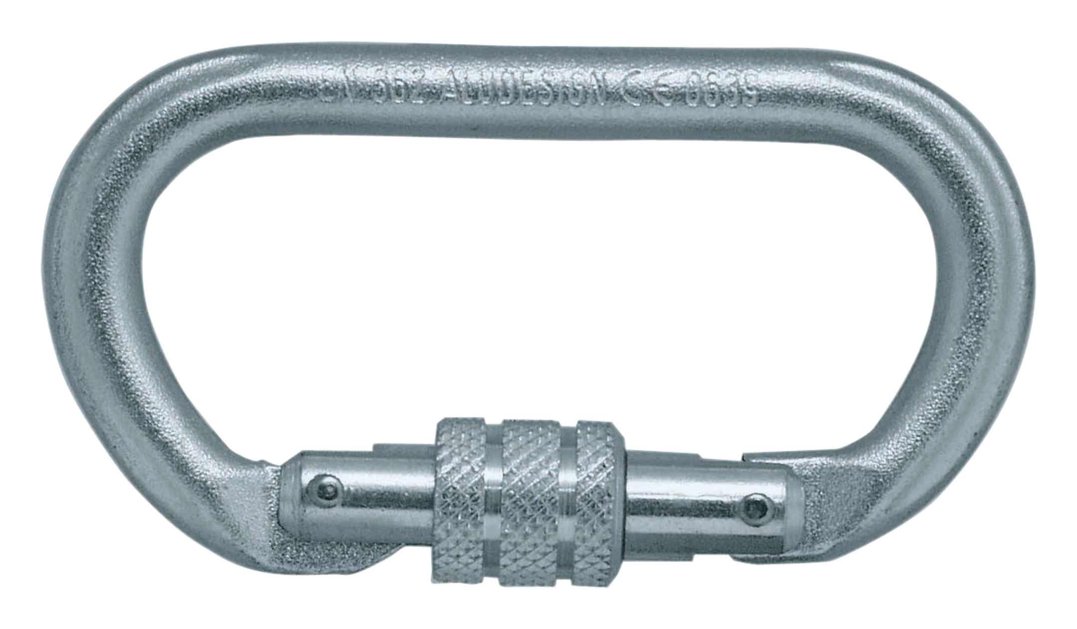Ovális karabíner, csavaros biztosítással. Anyag: Acél, Szakítóerő nyitva 7 kN, Szakítóerő vízszintes 9 kN, Szakítóerő függőleges 22 kN, Max. nyílás 18 mm, Súly 164 g, Hossz 108 mm, Szélesség 58,5 mm